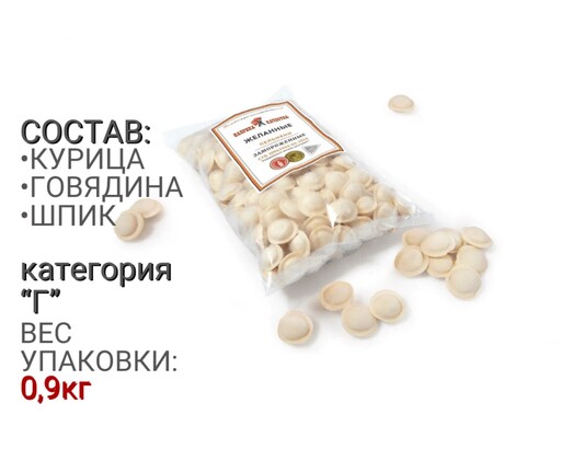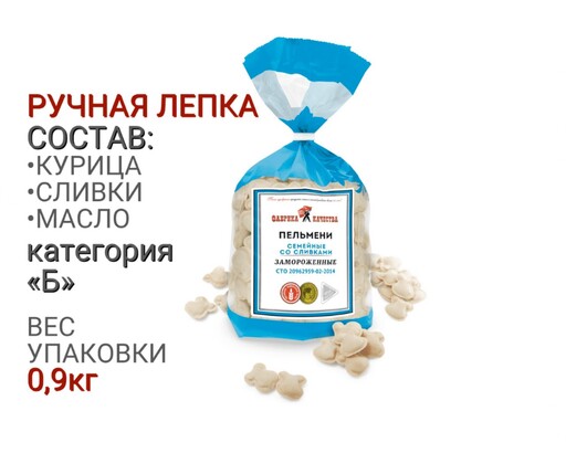 Нежный вкус и сбалансированный состав. Выигрышное сочетание свежих сливок и мяса курицы придётся по вкусу самым придирчивым гурманам. А забавная форма этих пельмешек возбудит аппетит даже у малоежек. Энергетическая ценность (на 100 г. продукта) Белок – 13 г.; Жир – 5 г.; Углеводы: 22 г.; Калорийность: 190 ккал/780 кДж.. Годен: при температуре не выше минус 18°С - не более 6 месяцев. Способ приготовления Пельмени варят в большом количестве подсоленной кипящей воды небольшими порциями (на 1 кг пельменей - 4л воды и 40 г соли). В воду можно положить лук, лавровый лист, укроп, петрушку. Варка занимает 8-12 минут. После того, как пельмени всплывут, надо уменьшить нагрев, чтобы они не распались, и варить еще 3-5 минут. Пельмени можно также жарить, запекать в духовке или горшочках.
