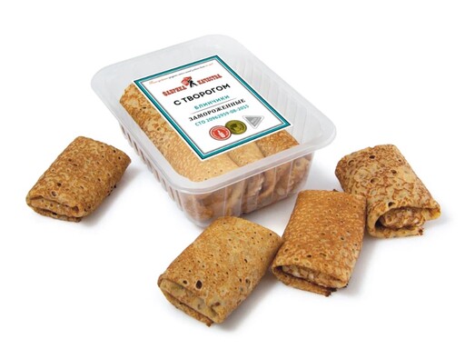 Основные ингредиенты: Тесто- вода, мука, яйца, сыворотка молочная сухая, сахар, масло подсолнечное, соль, разрыхлитель. Энергетическая ценность (на 100 г. продукта) Белок – 5,5 г.; Жир – 4,5 г.; Углеводы: 29,0 г.; Калорийность: 180 ккал /740 кДж. Годен: при температуре минус 18°С — не более 6 месяцев. Способ приготовления Разморозить, фаршировать, используя всевозможные начинки, разогреть на сковороде, в духовом шкафу или печи СВЧ в течение 2-3 мин. Недопустимо повторное замораживание полуфабриката