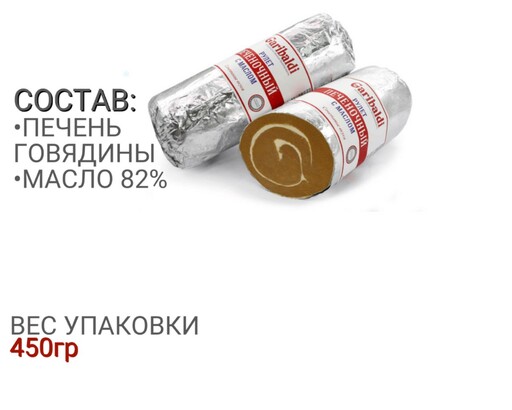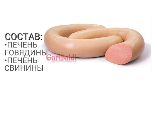 Печень говяжья, свинина, вода питьевая, молоко сухое обезжиренное, крахмал картофельный, соль нитритная (соль поваренная пищевая, фиксатор окраски Е250), соль поваренная пищевая, лук жареный, специи и экстракты специй (перец черный, паприка, орех мускатный), стабилизаторы Е410, Е412, Е415, Е472, регуляторы кислотности Е262, Е331, усилитель вкуса и аромата Е621, антиокислитель Е301. Пищевая ценность в 100 г продукта (средние значения): Белок 8 г, жир 32 г, углеводы 3 г, калорийность 334 ккал/1400 кДж. Срок хранения: при температуре 0+6°С не более 30 суток. После вскрытия упаковки хранить при температуре 0+6°С не более 36 часов.