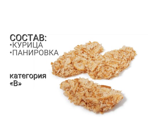 Филе цыплят-бройлеров в панировочных сухарях. Энергетическая ценность (на 100 г. продукта) Белок – 15 г.; Жир – 3 г.; Углеводы: 12 г.; Калорийность: 130 ккал/560 кДж. Условия хранения: при температуре не выше минус 18°С - не более 6 месяцев. Способ приготовления: разморозить, обжарить с двух сторон до золотистой корочки и довести до готовности.
