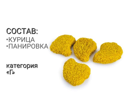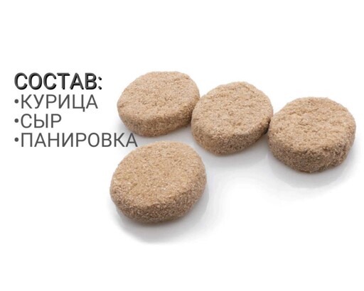 Филе цыпленка-бройлера, кожа цыпленка-бройлера, вода питьевая, пищевое растительное волокно, сухари панировочные, молоко сухое обезжиренное, соль поваренная пищевая, яичный порошок, ароматизатор курицы, ветчины, сливочного масла. Пищевая ценность в 100 г продукта (средние значения) Белок 13 г, жир 12 г, углеводы 3 г, калорийность 172 ккал/719 кДж. Хранить при температуре хранения не выше минус 18°С не более 90 суток. Продукт не подлежит повторной заморозке