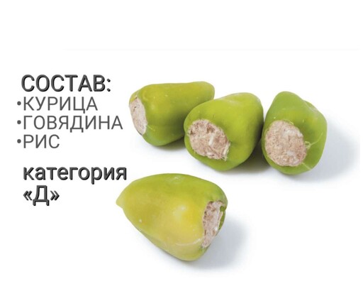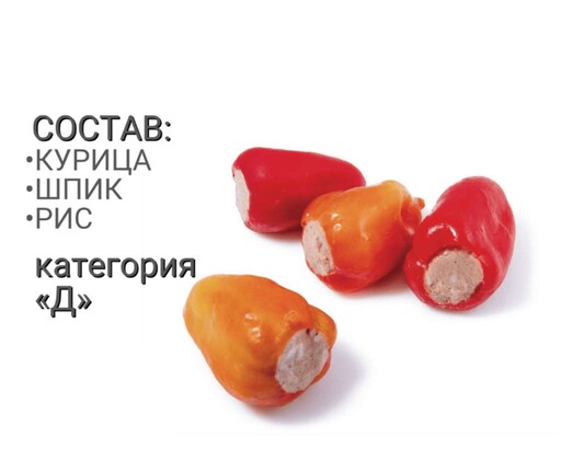 Перец сладкий с начинкой из курицы, говядины, риса. Натуральные специи: перец чёрный молотый, чеснок, горчица, кориандр, перец душистый, паприка, тмин, майоран, имбирь, цветок муската. Энергетическая ценность (на 100 г. продукта) Белок – 5,5 г.; Жир – 5 г.; Углеводы: 6 г.; Калорийность: 90 ккал/380 кДж. Хранить при температуре не выше минус 18°С - не более 6 месяцев. Способ приготовления: разморозить, тушить в соусе (можно без соуса) до готовности.