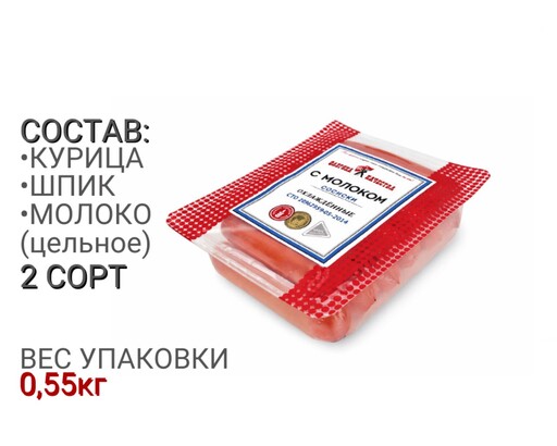 Лёгкие и нежные сосиски на основе мяса цыплят-бройлеров и сочного шпика. Рецептура обогащена цельным молоком и сухими сливками, которые придают продукту молочные ноты во вкусе и нежную консистенцию. Сосиски прекрасным вариантом для быстрого обеда или семейного ужина. Энергетическая ценность(на 100 г. продукта)Белок – 10,0 г.; Жир – 14,0 г.; Калорийность: 170ккал/700кДж.